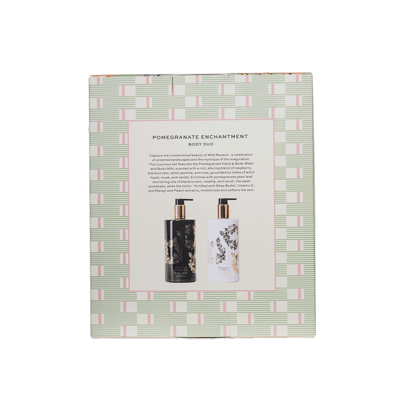 This luxurious set features the Pomegranate Hand & Body Wash and Body Lotion, scented with a rich, alluring blend of raspberry, blackcurrant, white jasmine, and rose, grounded by notes of witch hazel, musk, and vanilla. Enriched with pomegranate pearl and nourishing oils of blackcurrant, rosehip, and neroli, the wash revitalises, while the lotion - fortified with Shea Butter, Vitamin E, and Mango and Peach extracts, moisturises?and softens the skin.