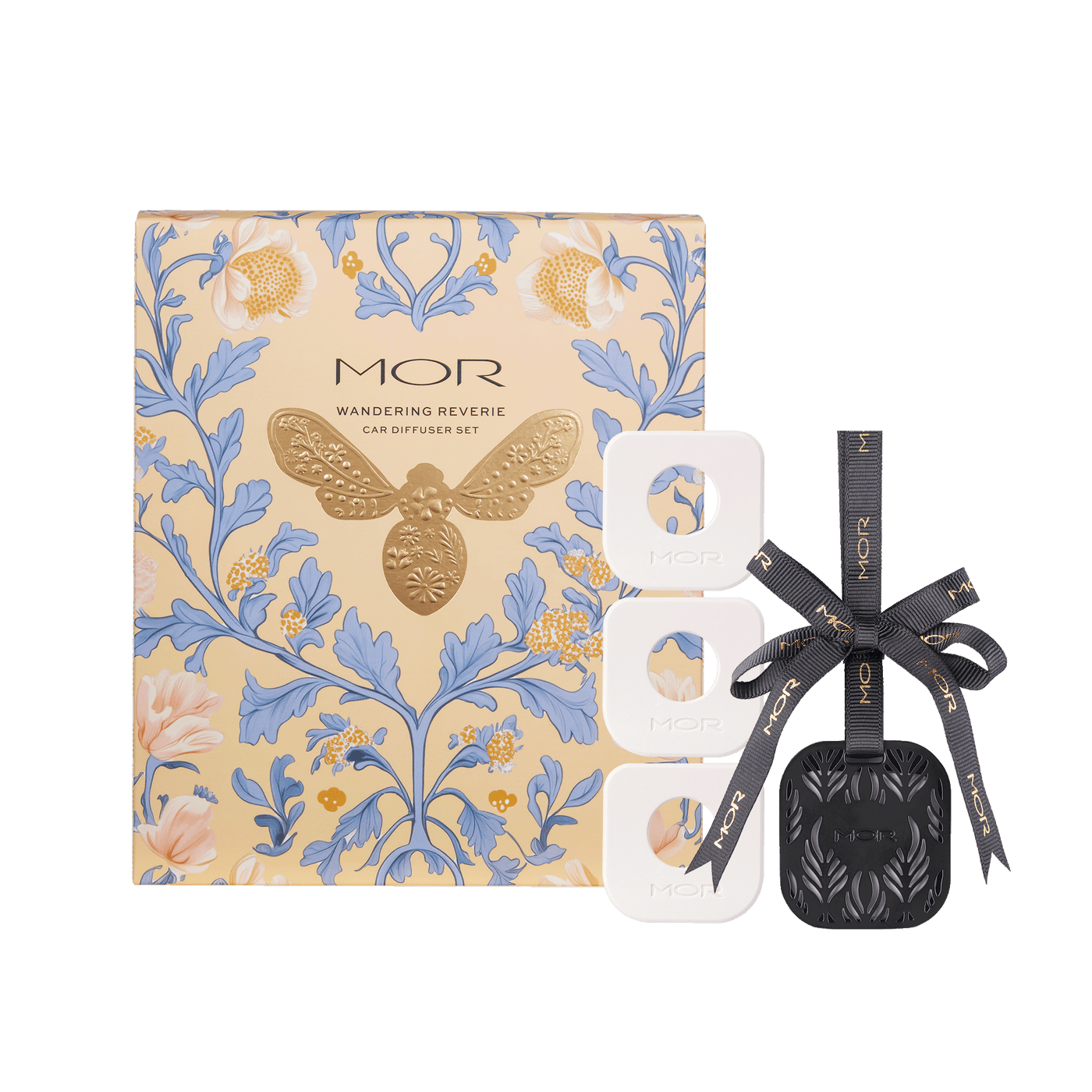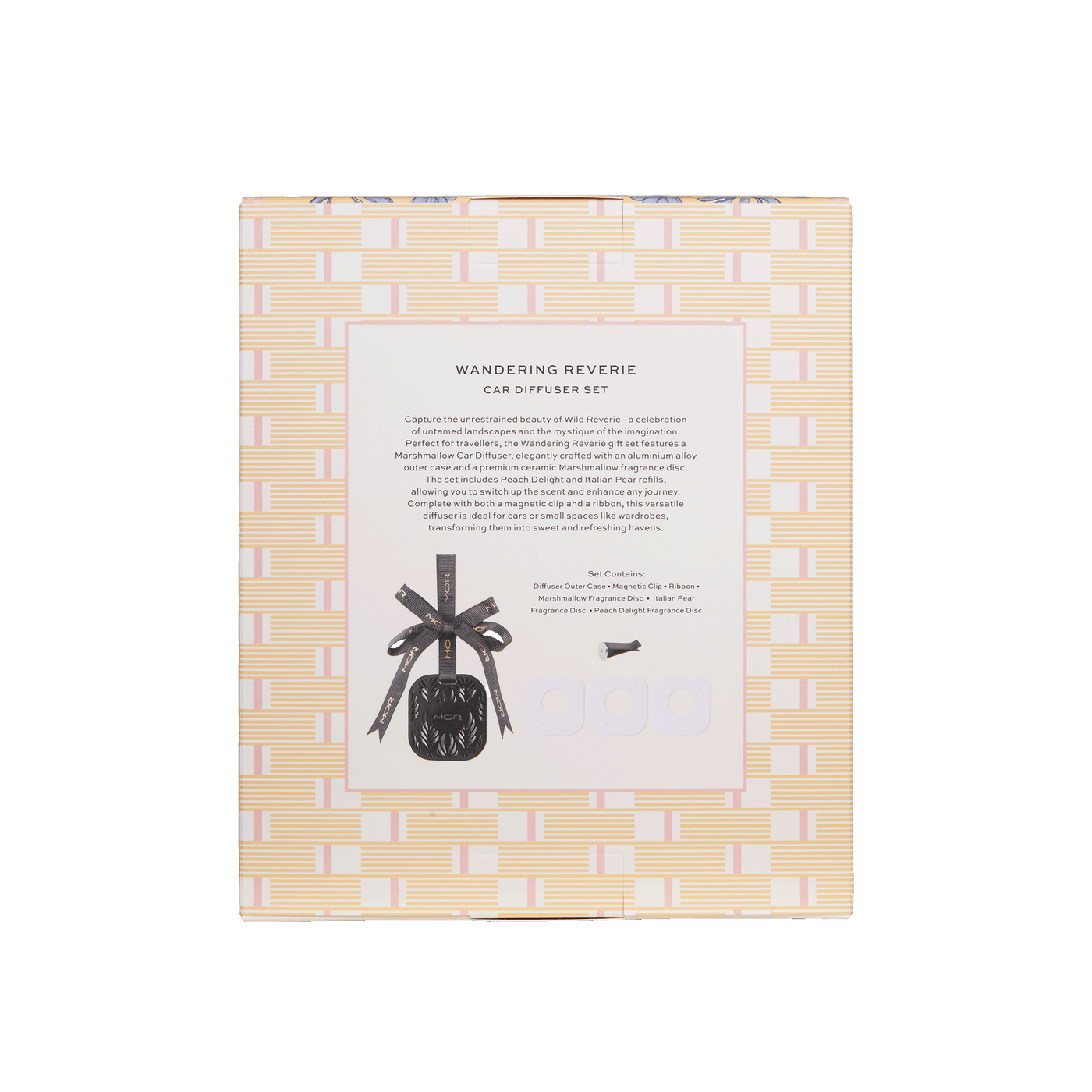 Perfect for travellers, the Wandering Reverie gift set features a Marshmallow Car Diffuser, elegantly crafted with an aluminium outer case and a premium ceramic Marshmallow fragrance disc. The set includes Peach Delight and Italian Pear refills, allowing you to switch up the scent and enhance any journey. Complete with both a magnetic and a ribbon, this versatile diffuser is ideal for cars or small spaces like wardrobes, transforming them into sweet and refreshing havens.?
